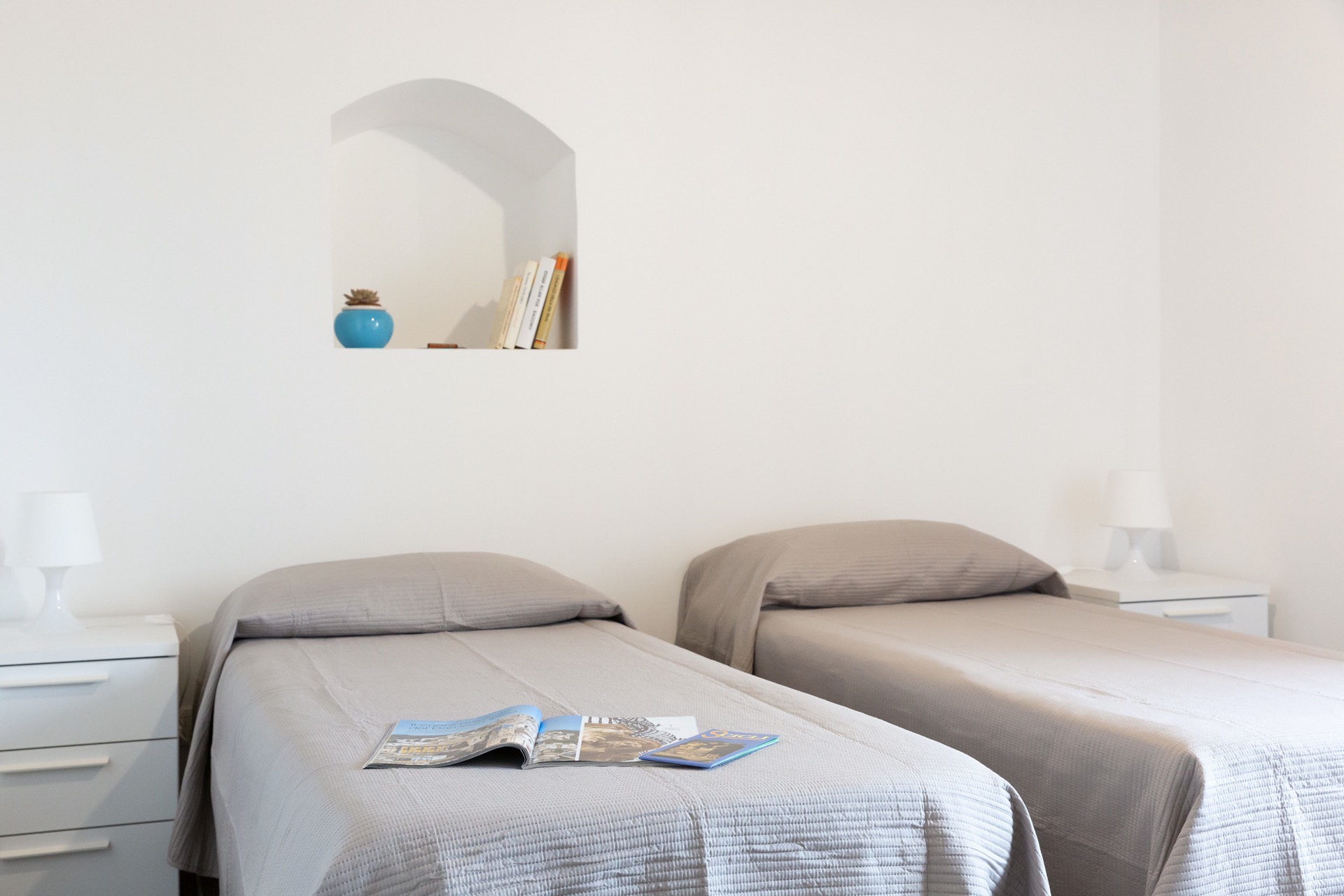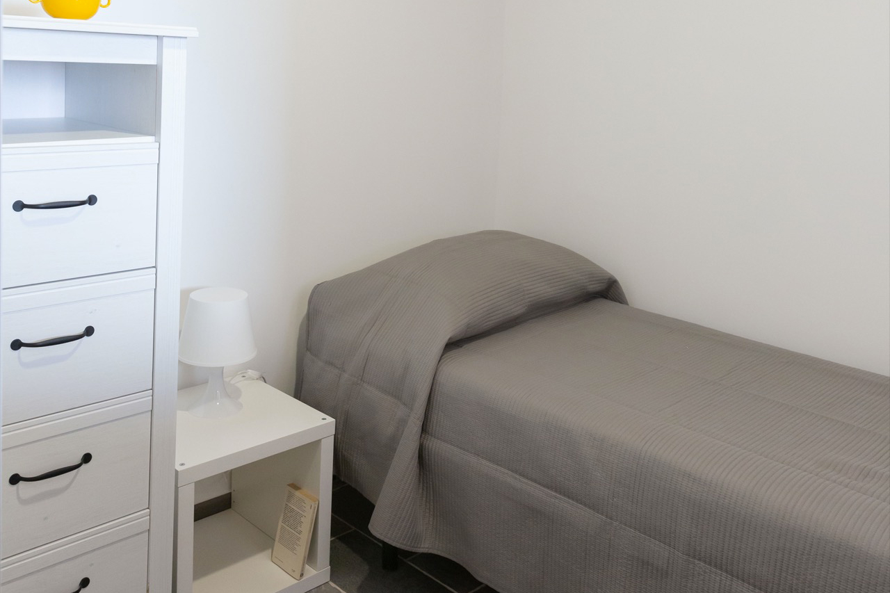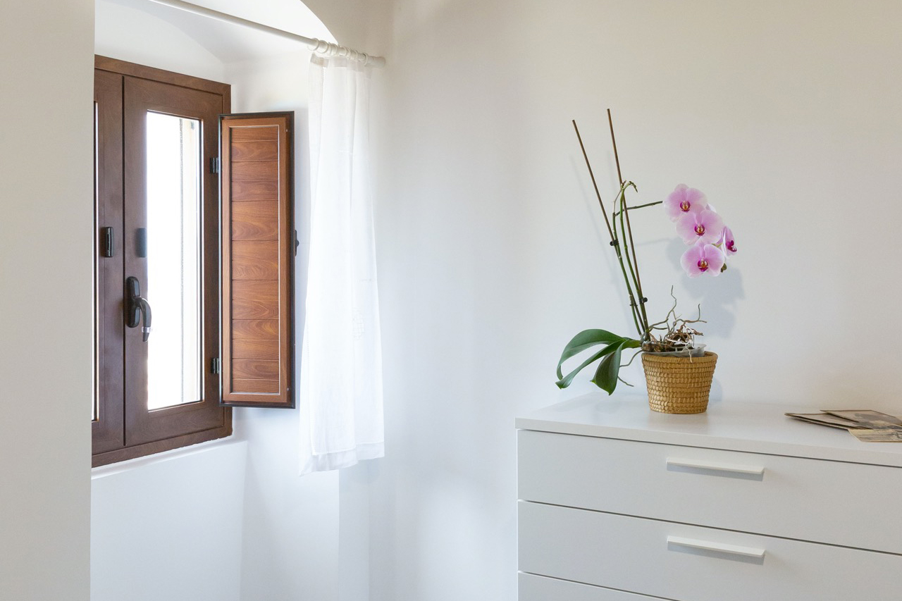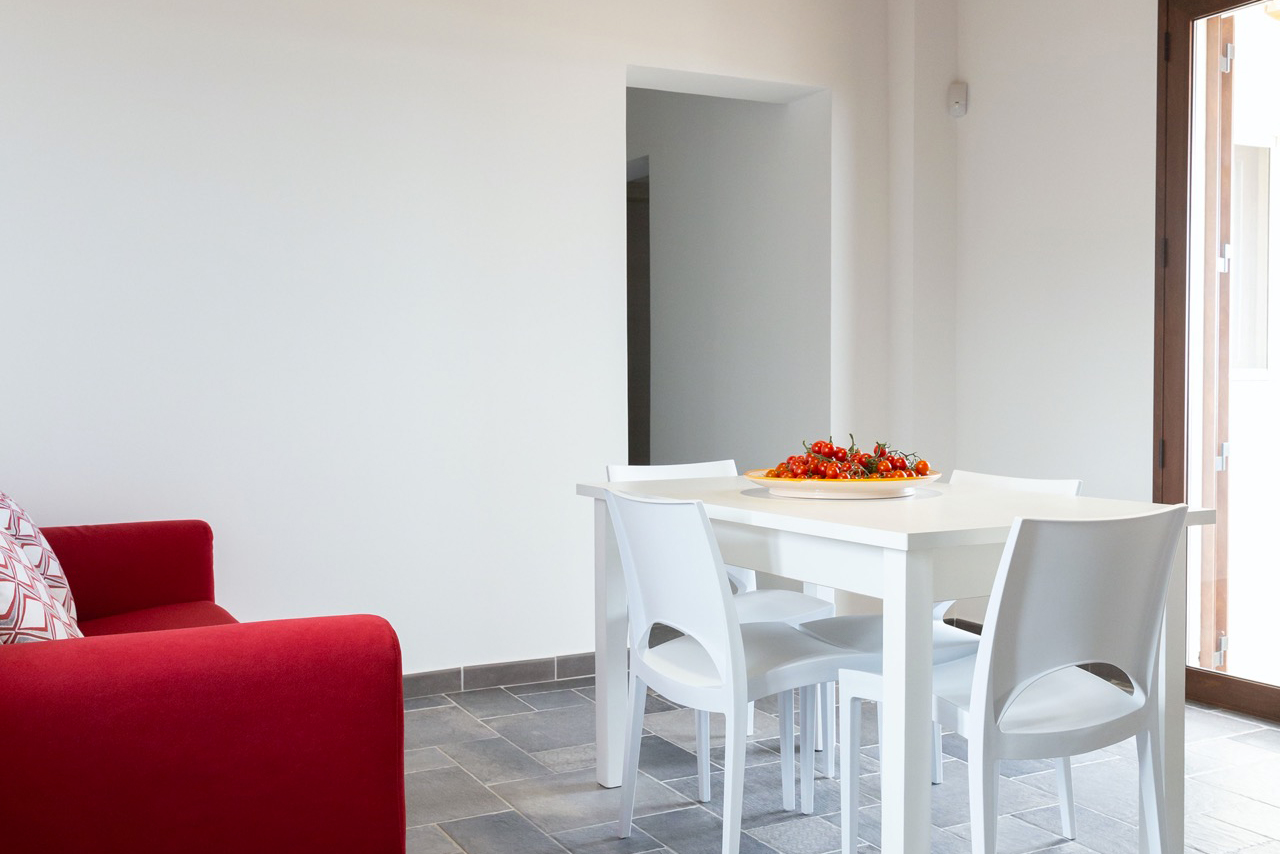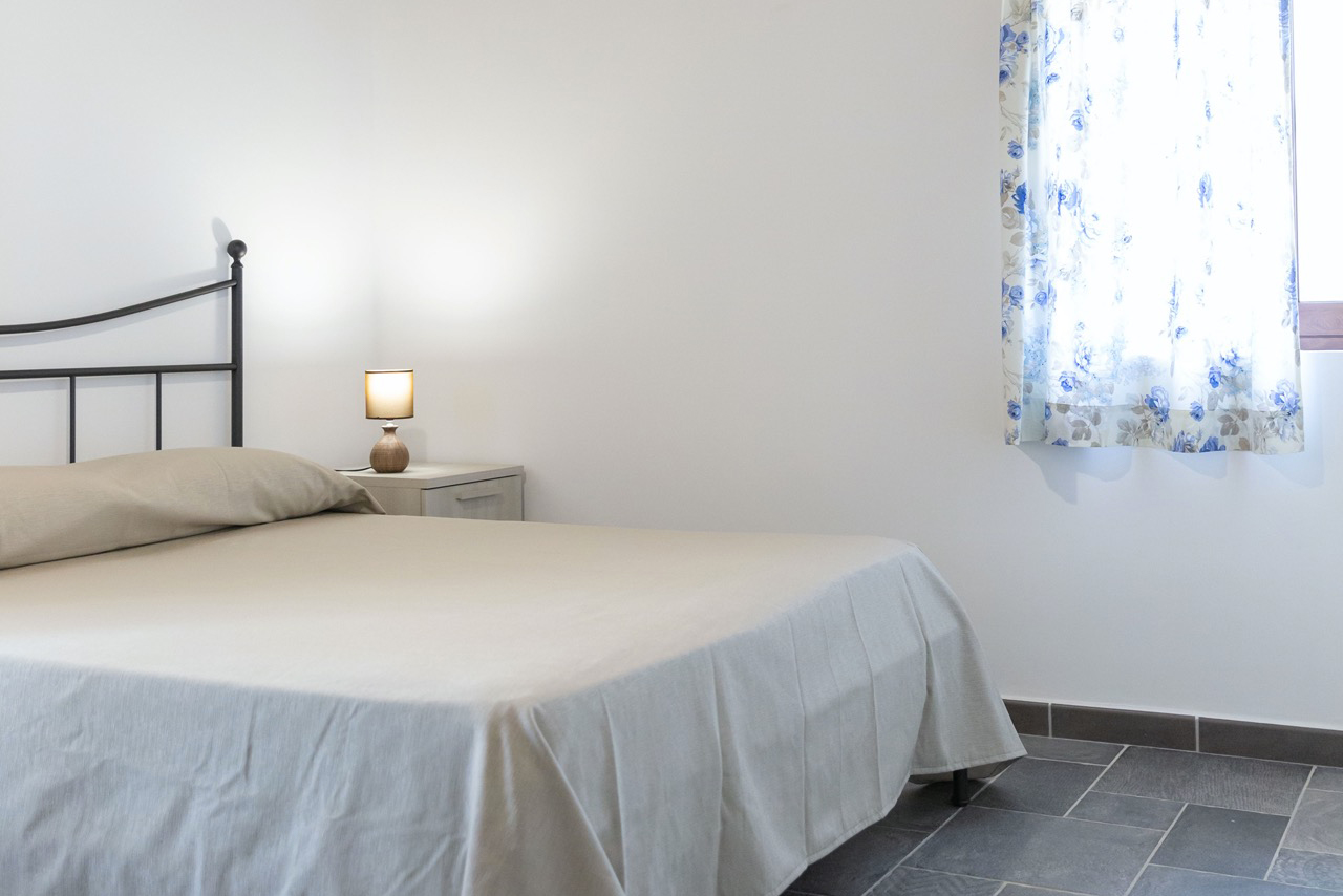 Vi si trovano due camere doppie e una singola, arredate con gusto, fresche e luminose, un bagno e la cucina-soggiorno, da cui si puo accedere a una panoramica terrazza coperta e arredata con tavolo e sedie.