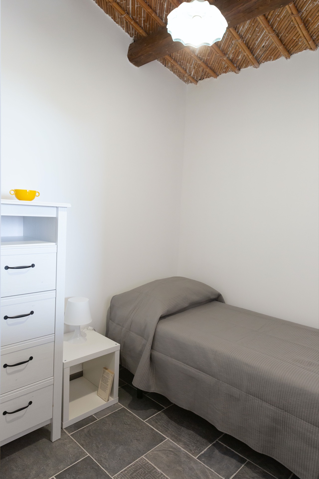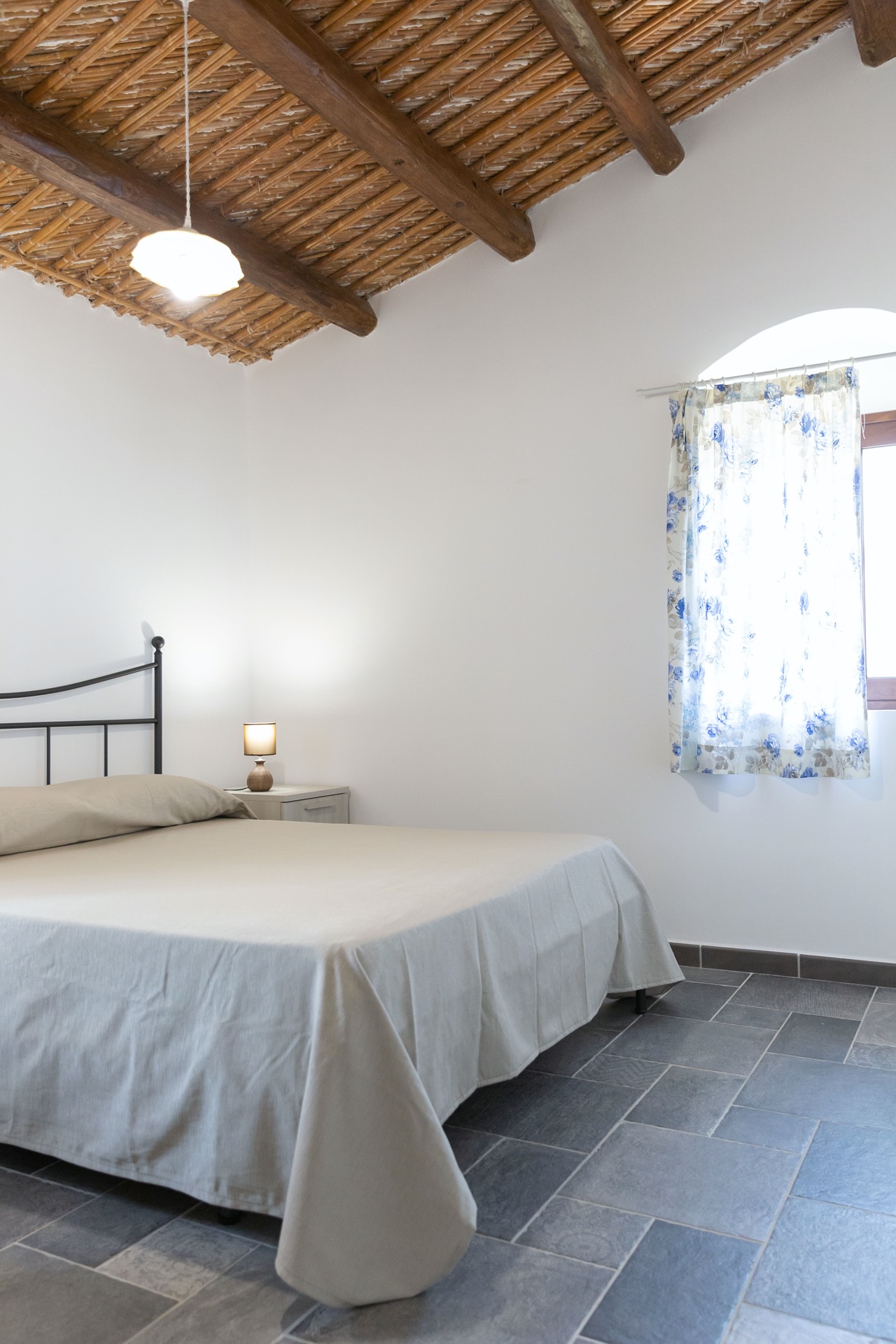 In questo appartamento è stato mantenuto il tetto a vista in canna e gesso, sostenuto da grosse travi di legno. Durante la ristrutturazione, tra la colata di gesso e le tegole, sono stati interposti dei materiali adatti ad aumentare la coibentazione. Per dare continuità a questo bel tetto, la copertura della terrazza è stata fatta con stuoie di canne palustri siciliane.